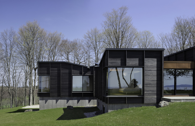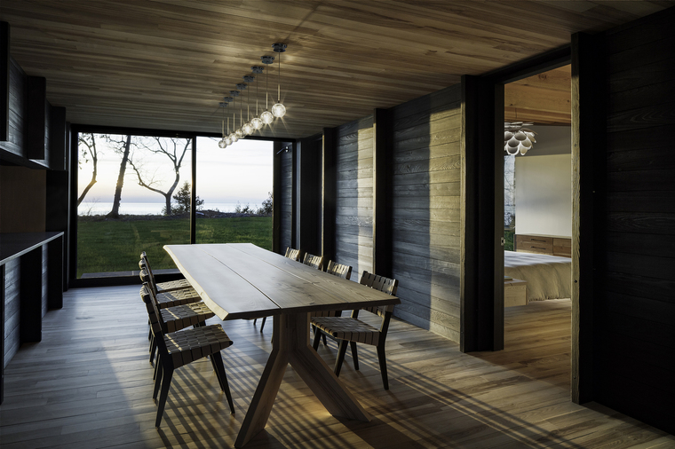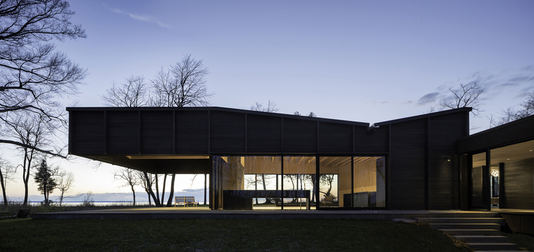 小木屋,从小木屋可以俯瞰到美丽的密歇根湖。小木屋由三种结构构建而成,用于聚集空间的结构包含了客厅、厨房、观景休息平台,而其他两个结构是用来支撑主卧和三个小孩子的卧室的。餐厅的走廊连接了这三部分结构。有着微微的起伏屋顶,随着自然地形的变化,成为附近渔民一个俏皮的参考物。