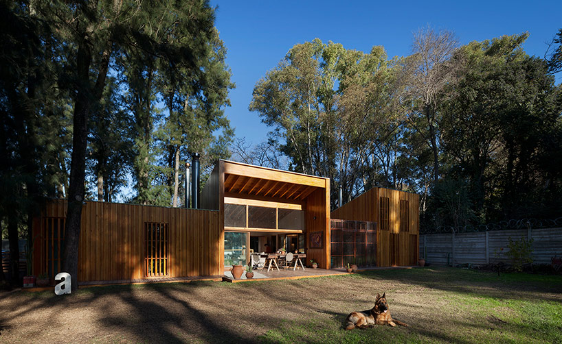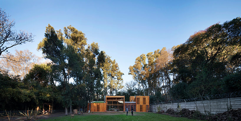 阿根廷建筑事务所IR arquitectura与我们分享的项目,是位于阿根廷布宜诺斯艾利斯(Buenos Aires)郊外托尔图吉塔斯市(Tortuguitas)的 Casa Aa节能住宅。在这个养育着孩子的家庭住宅,家里明确地划分出大人与小孩间的分隔,同时又融入树木茂盛的场地环境中,拥有进行室外活动的空间和充沛的阳光。波浪状聚碳酸酯屋顶覆盖下的半室外绿色庭院是个温室和有顶花园空间,并与位于中心位置的矩形起居空间相邻。共享的起居区和主卧拥有朝北最高的洞口,使能照射到的阳光最大化,而建筑的外部形态因此被分割成四部分。上下交替的倾斜绿色屋顶提供了一个很好的天然热绝缘体,还有助于替换建筑所占据的自然地被。