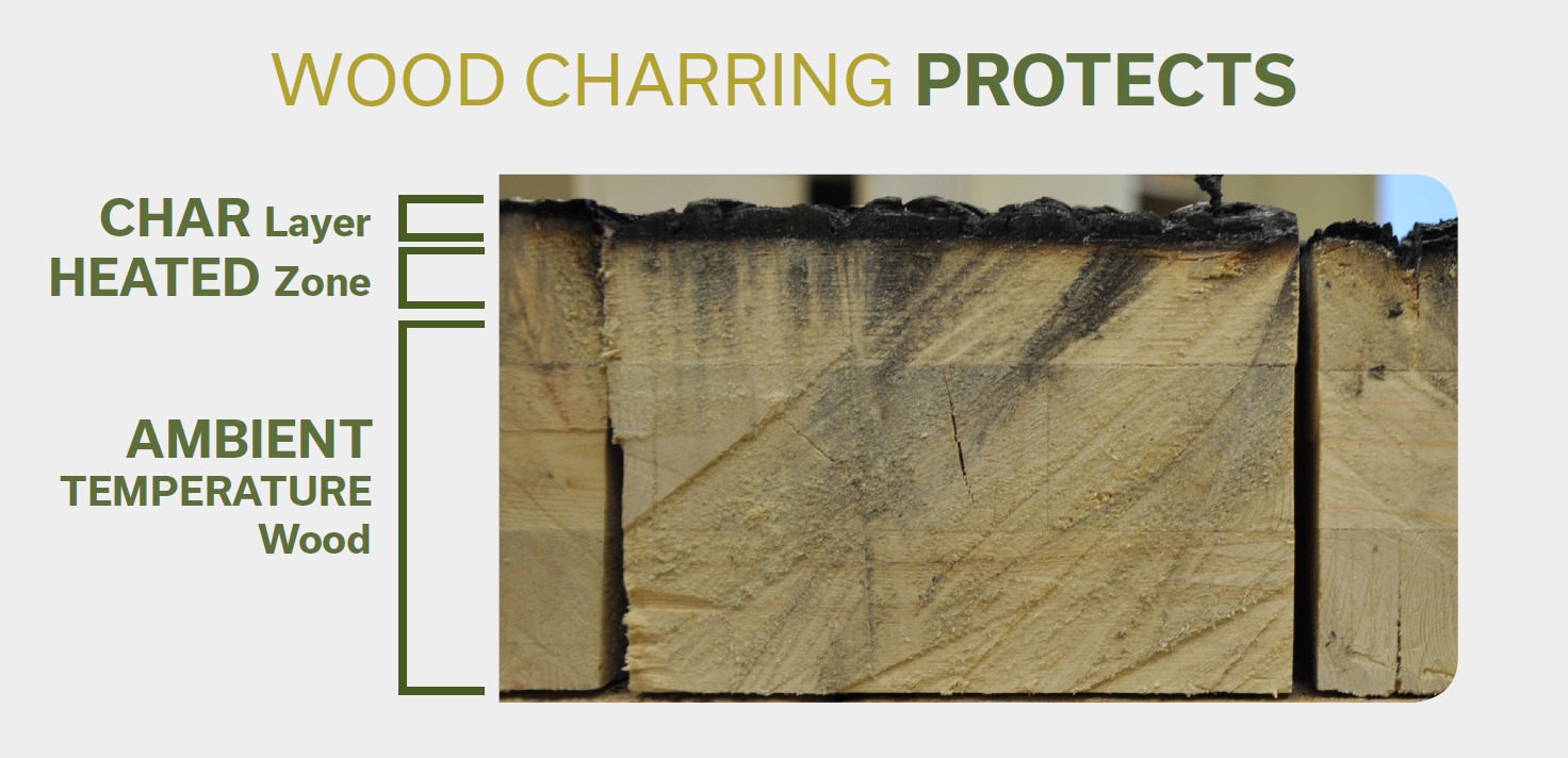 大块木材通过内层的隔热层而具有耐火性。当木材暴露于火中时,暴露的表面会燃烧,从而形成自然的碳化?;げ恪L炕阕魑衾氩?,延迟了下层木芯的加热。由于大块木材是由实心的部件组成,空气和火势蔓延被抑制了。炭以可预测的速率(约3.81厘米每小时)形成,以减慢燃烧和火势蔓延。