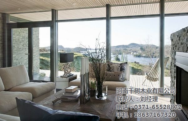 河南木别墅的尺寸和视野,是我们喜欢的一个焦点。特别对于度假木屋,在室内平静的与户外自然景观对话,是大窗户的重要意义。大窗户在木屋中,提供最佳漂亮的风格,当然对于木屋设计也是至关重要,如何漂亮美观还要节能。如:窗户与墙壁空间的比例、窗户的形状和尺寸及屋顶的配置都是设计的考虑因素,方向叶是很重要的,可能会建议包括深檐和倾斜的窗户方向以便在减轻阳光。