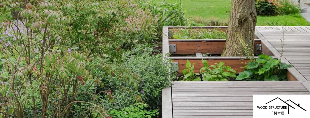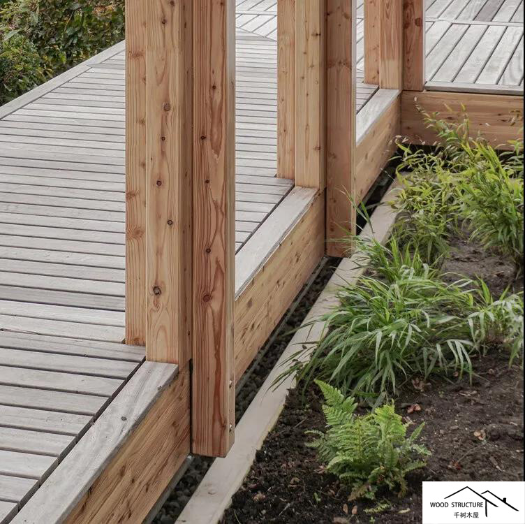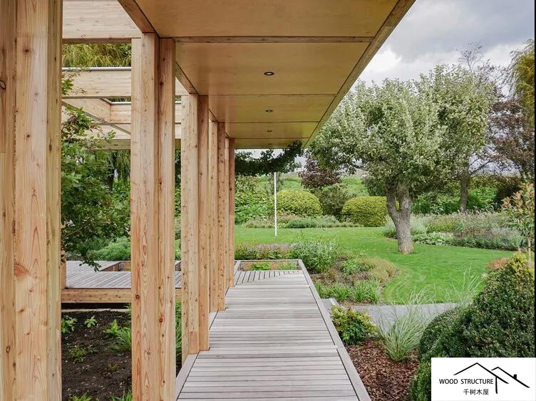 露台甲板桥面悬挑在一条现有的沟渠上,这条沟渠创造了花园和农田之间的边界。从这个有利的位置可以观察到不断变化的农田。凉棚与建筑结合在一起,从内部与花园建立了非常直接的关系。大部分雨水通过屋顶引导到凉棚,灌溉植物和树木。这个??榛峁共捎寐湟端刹阊菇汉习逵隒LT组合而成。
