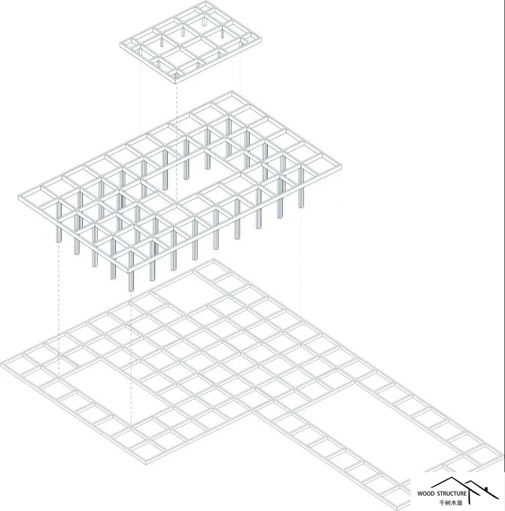 三个CLT墙体组成的结构增加了柱和梁结构的稳定性。它是一个1.5米模数网格上的??榛峁股杓?。十字形的柱子放在网格上,支撑着屋顶。模块化结构由六个预制构件填充。内部楼层地板、外部楼层地板、开放式立面、封闭式立面、内部屋顶板和外部屋顶板。在某些地方,建筑被故意留下未填充的空间,为植物和树木创造空间。木材,木材,木材,这个建筑是用木材做的,以尽可能降低“碳排放”。