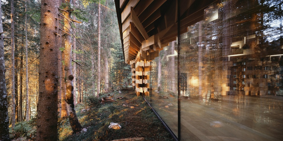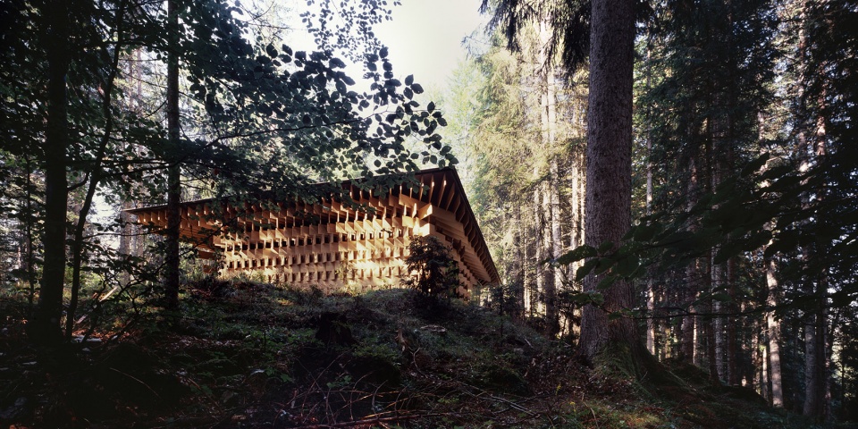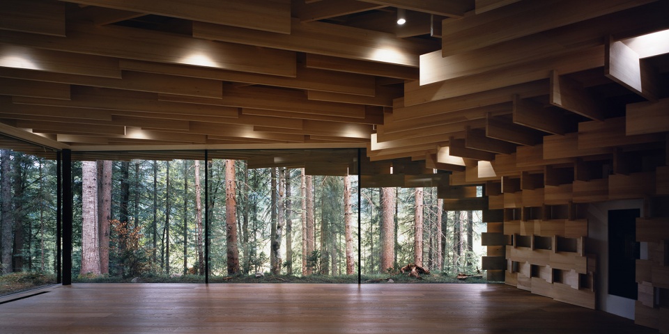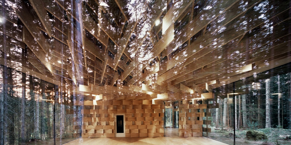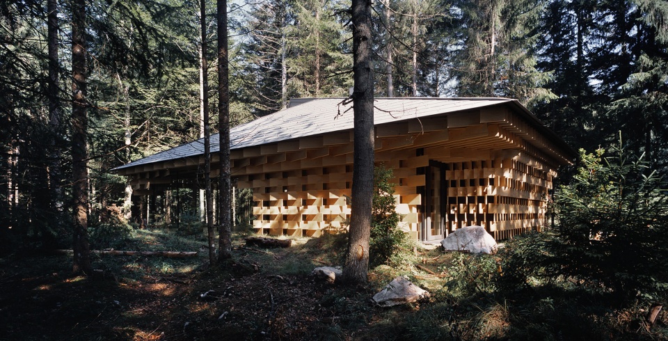 该建筑以生长在场地附近的冷杉树为主要材料,3厘米宽的木板像树枝一样堆叠起来,在广阔的森林和精致的建筑间形成一种柔和的过渡。小屋同样也充当了使人融入森林的媒介。阳光透过枝叶间的缝隙从天窗透进室内,带来森林中常??梢蕴逖榈降?ldquo;komorebi”(木漏れ日)般的效果。