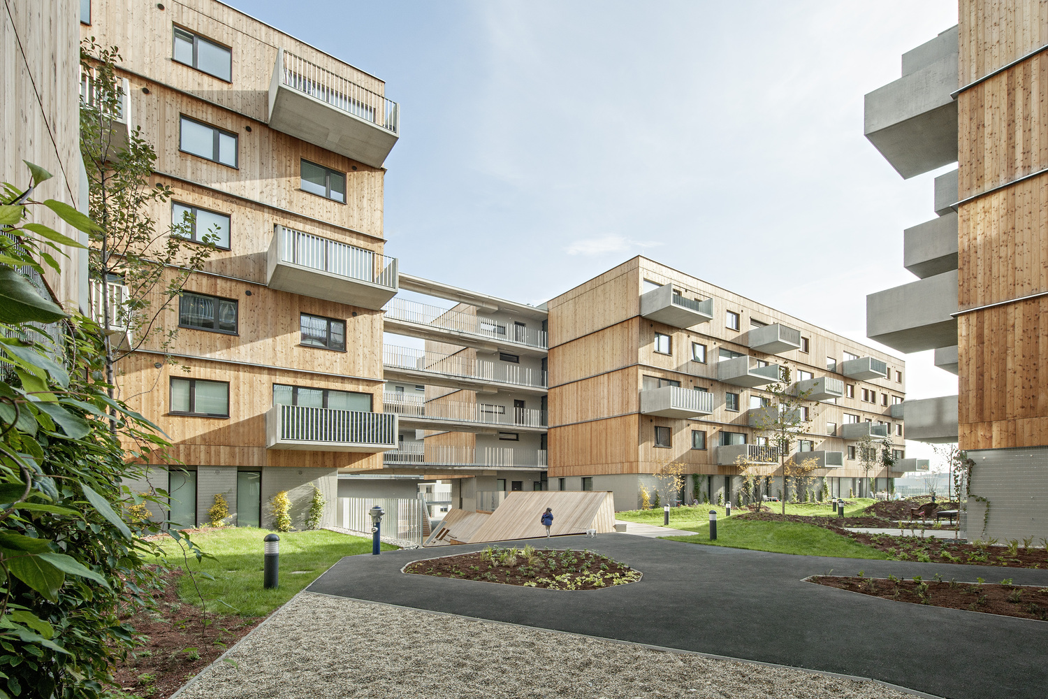 各个部分通过三排南北方向的通道平台相互连接。这三条流通路线通过一系列采光楼梯、内部走廊和开放的通道平台,提供了不同的空间体验。串行的线性基本结构为布置不同类型的公寓提供了极大的灵活性,因此允许居民的交流。公寓平面图的设计非常灵活。它们可以在以后以各种方式改变。尽管它们有一个很好的能源平衡,但建筑仍然向外开放。结合使用木材作为建筑材料,使整个建筑群既轻盈又有深度。