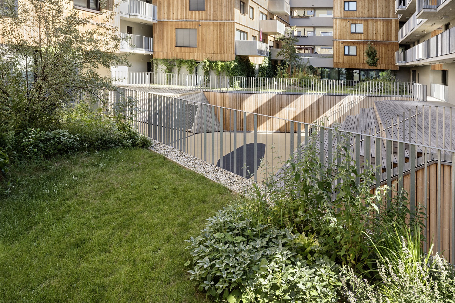 绿色的庭院与一些长满青草的小山丘一起,形成了一个有机的景观,这些庭院的翼形梯田有意地凸显在中央庭院的中间。山丘、树木和带小树冠的灌木遮挡了私人露台。通往丘陵景观的道路网络被刻意限制,以防止走廊式路线的发展。在入口区、洗衣房和儿童游乐场前的路口形成了聚会场所。