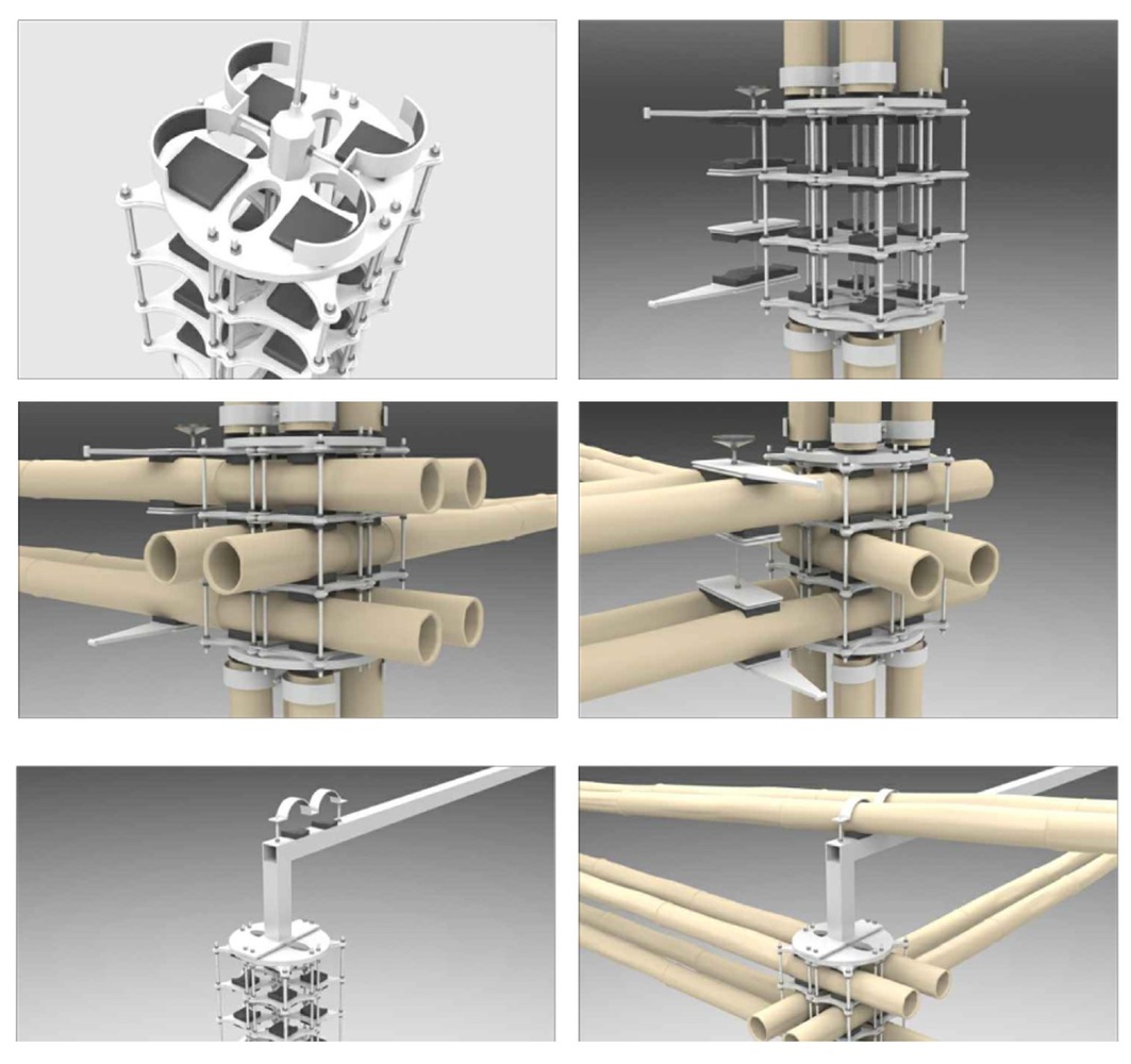 设计干式连接,不要通过穿孔削弱竹子,也不要用混凝土填充竹子,还可以根据需要更换竹杆;