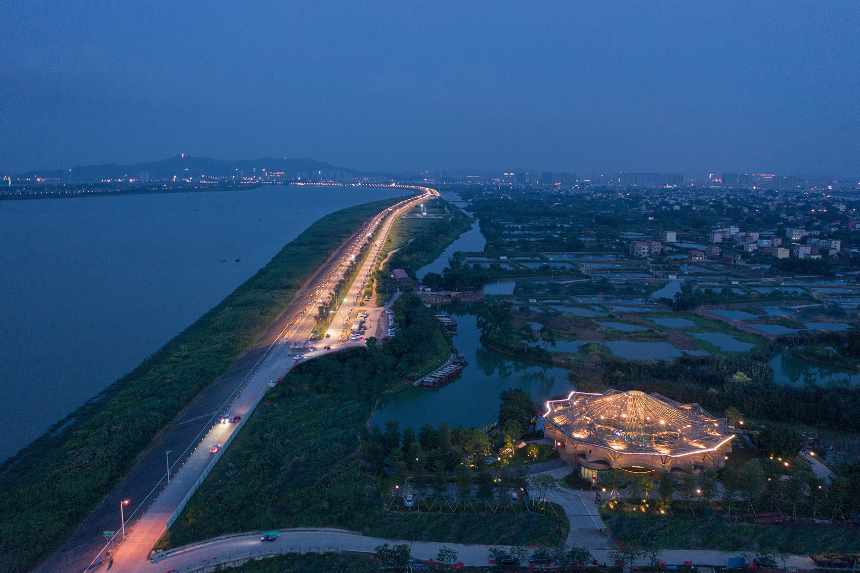 该项目设计灵感源自于古劳水乡荷塘水道的行船体验。炎炎夏日,在荷叶丛中看着风吹荷动,感受着微风拂面,轻松惬意。古劳水乡宾客中心,立体化抽象了荷叶褶皱的肌理,为四方宾客营造了驻足停留、远眺西江,以及放松冥想的公共休憩空间。