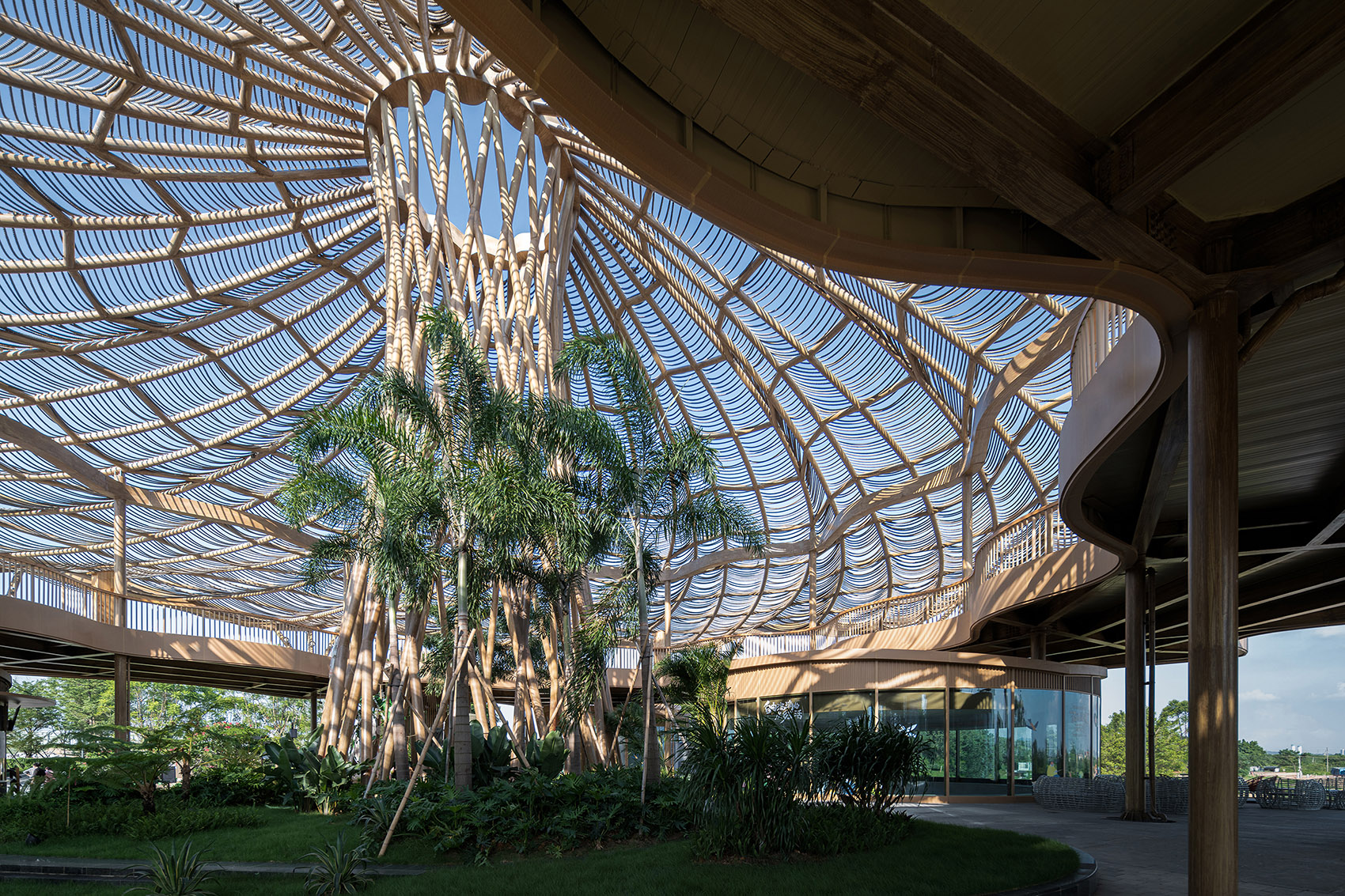 屋顶采用当地天然材料麻绳遮阳,在保证了整体建筑完整性的同时,将地域生态的材料用现代悬挂的形式呈现,提升了屋顶观览区的观赏性,使整个建筑也成为了一道靓丽的风景线。