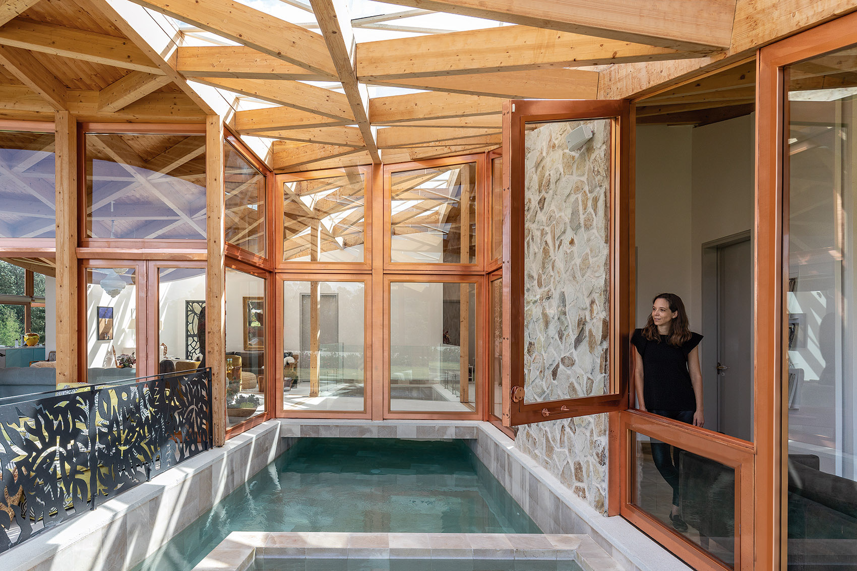 在室内,一处位于平面中央的缝隙空间将住宅明确地划分为社交空间和私人空间两部分,同时也在形式上保留了“庄园住宅”的传统布局。天窗照亮了室内外水池与中央交通空间,同时创造出交叉通风与拔风效应,以绿色的生物气候策略营造出舒适的室内体感环境。