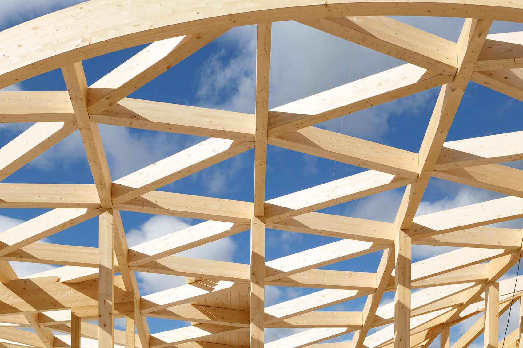 项目中的每一块木头都采用了自动化机器精确地切割和制造,进而在组装时创造出一幅完美匹配的拼图。叠层梁和曲线梁以相同的半径重复,为屋顶塑造出不同的折叠效果。结构的三角划分方式创造了高效的组装流程,同时也十分便于运输。建筑饰面采用了当地材料,如石材、瓷砖等,带有铜色涂层的钢窗则是由本地工匠手工制作而成的。